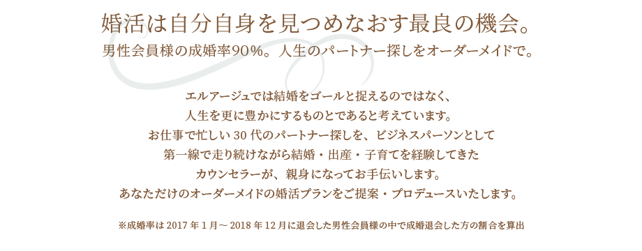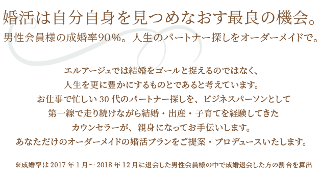 エルアージュでは男性のお客様の結婚相談を頂きましたら、緻密な成婚までのプランニングを弊社のカウンセラーと行います。「いつまでに」、「どのような方」と「どのくらいのペース」で出会うべきかといった数値化されたプランをお客様と一緒に考え、プランの実行まで徹底してサポートさせて頂きます。一見、ストイックに聞こえる方法ですが、日々お仕事でご多用な30代-40代男性の方々からは次に取る行動が明確になり、迷いなく活動ができると大きな支持を頂いております。