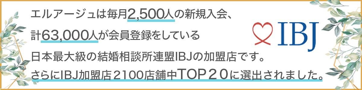 エルアージュは業界最大手のIBJ結婚相談所連盟の正規加盟店であり、全国2,100店舗中TOP20にランクイン致しました。成婚卒業者の満足度に始まり、成婚数、成婚率、成婚成長率という3つの点で高い評価を頂いております。